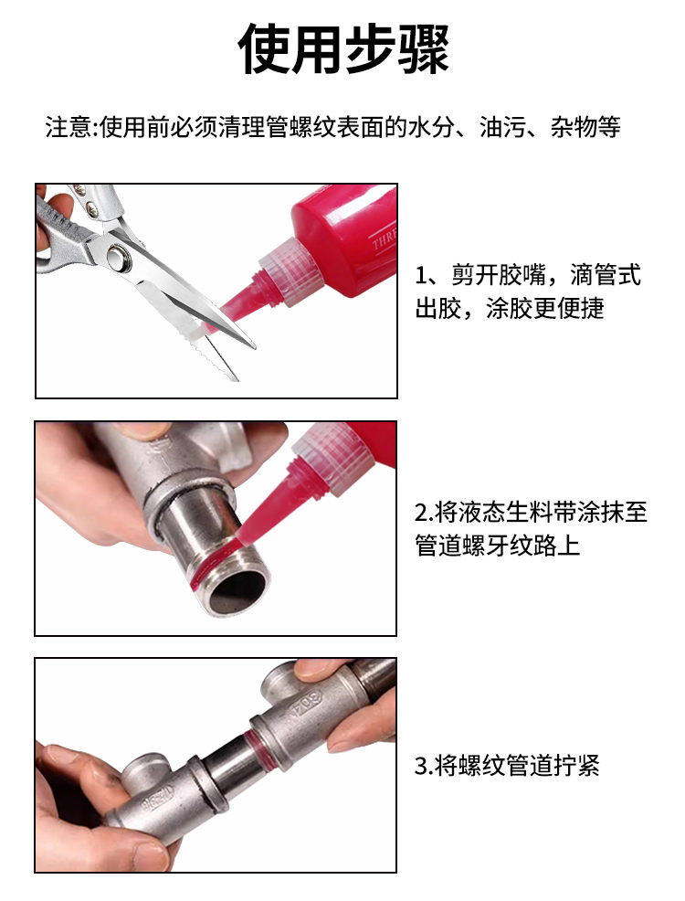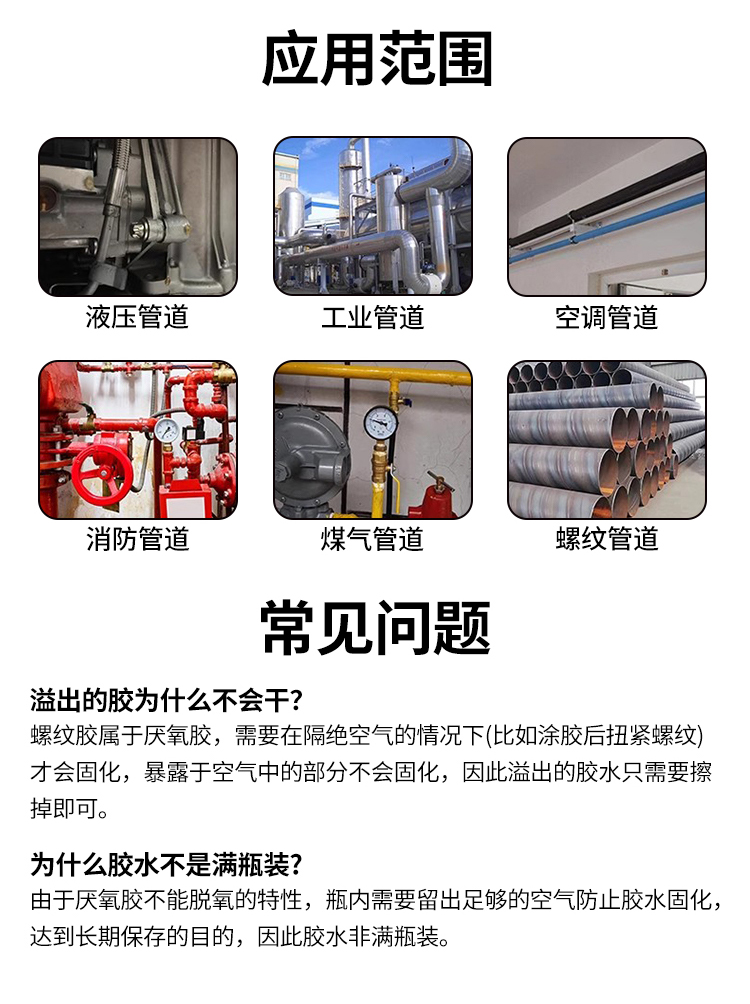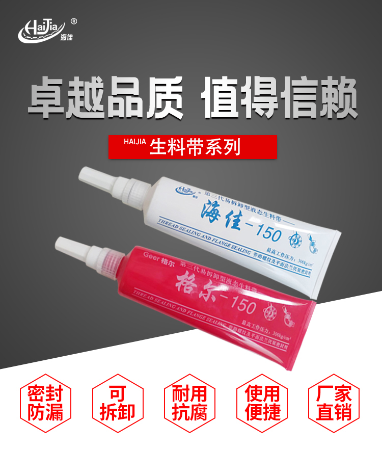 液態(tài)生料帶特性:是以進口材料為主原料的厭氧型密封膠,該產品在低密度聚乙烯瓶內由于與氧(空氣)充分接觸使膠液保持穩(wěn)定,固化物具有粘接強度高、密封性好、耐腐蝕、耐高溫、耐老化等特點取代傳統(tǒng)的PTFE膠帶和密封膠,只在螺牙內缺氧固化,不會堵塞.