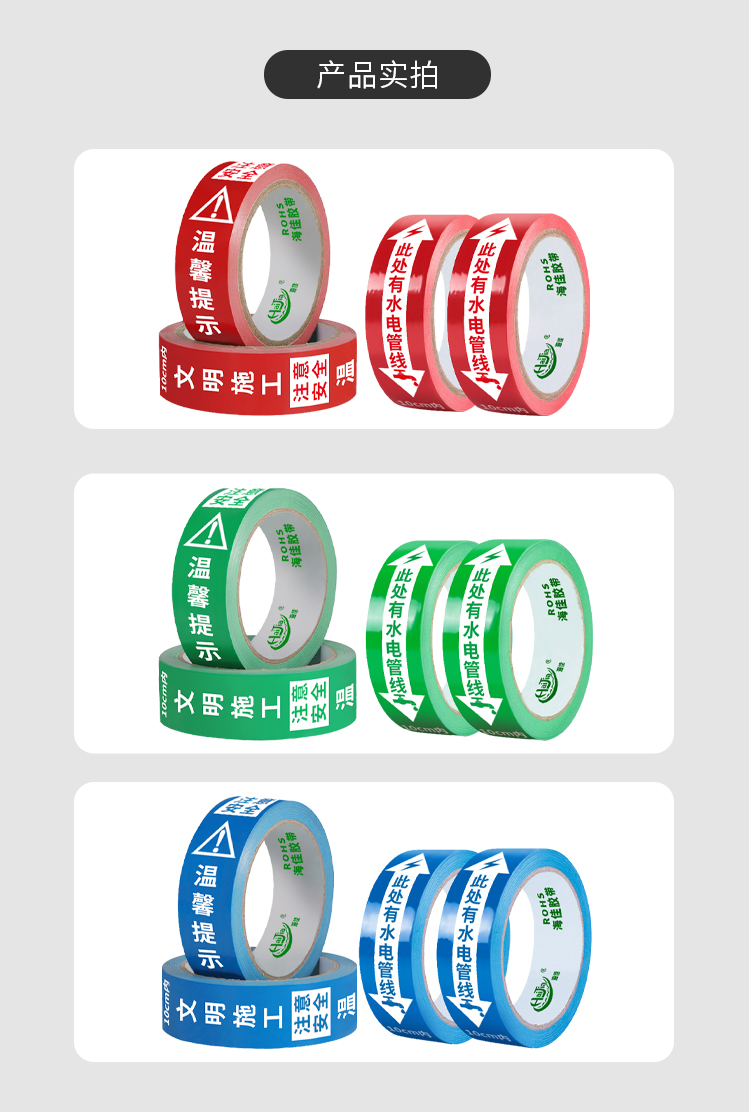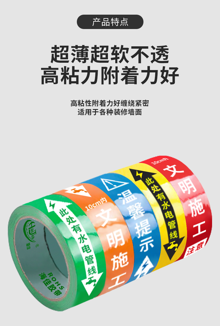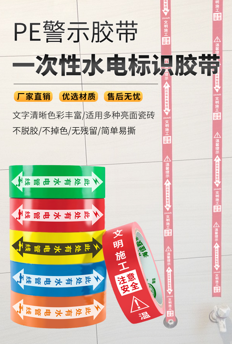一次性水電標(biāo)識膠帶 文字清晰色彩豐富/適用多種亮面瓷磚不脫膠/不掉色/無殘留/簡單易撕